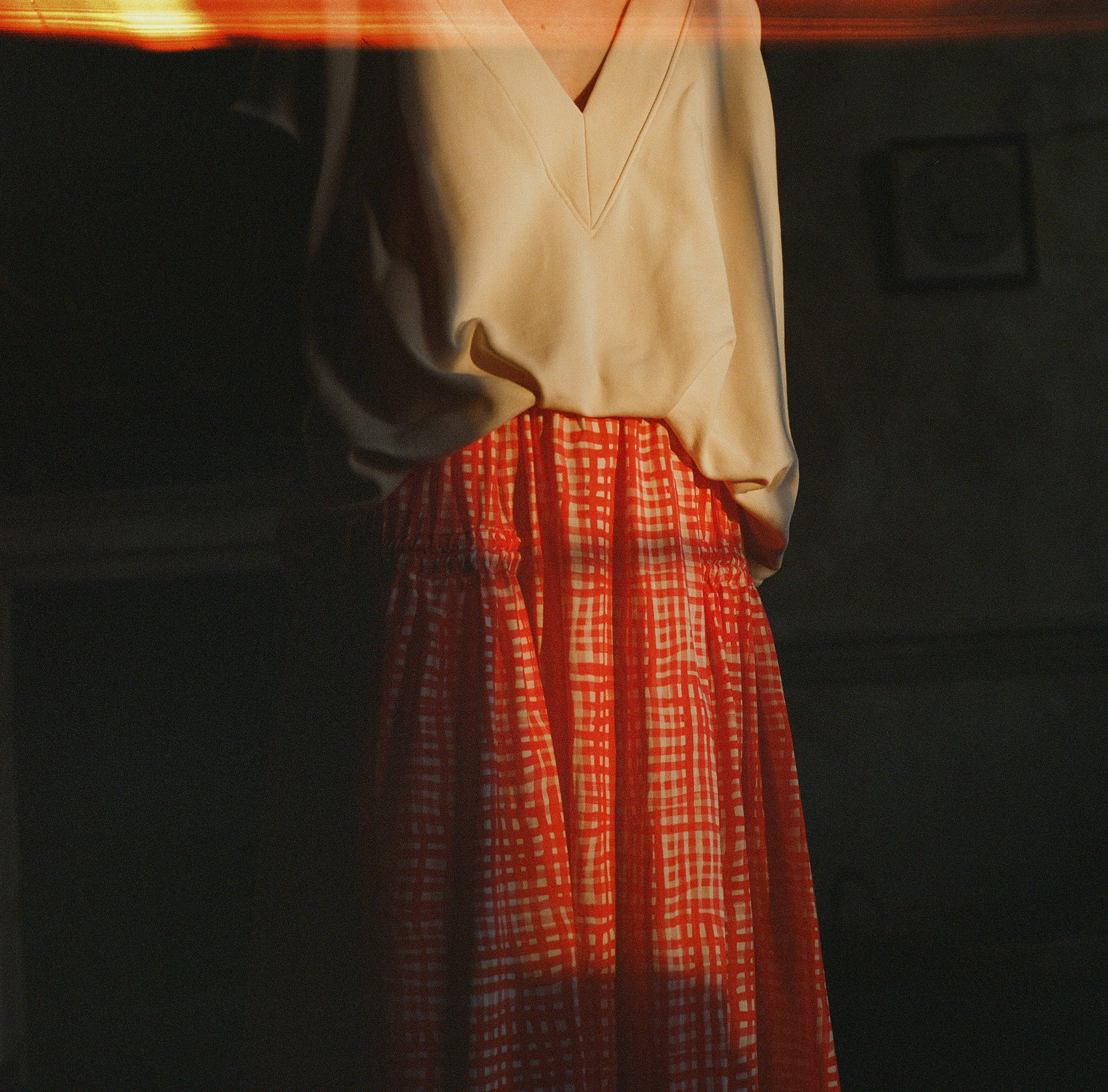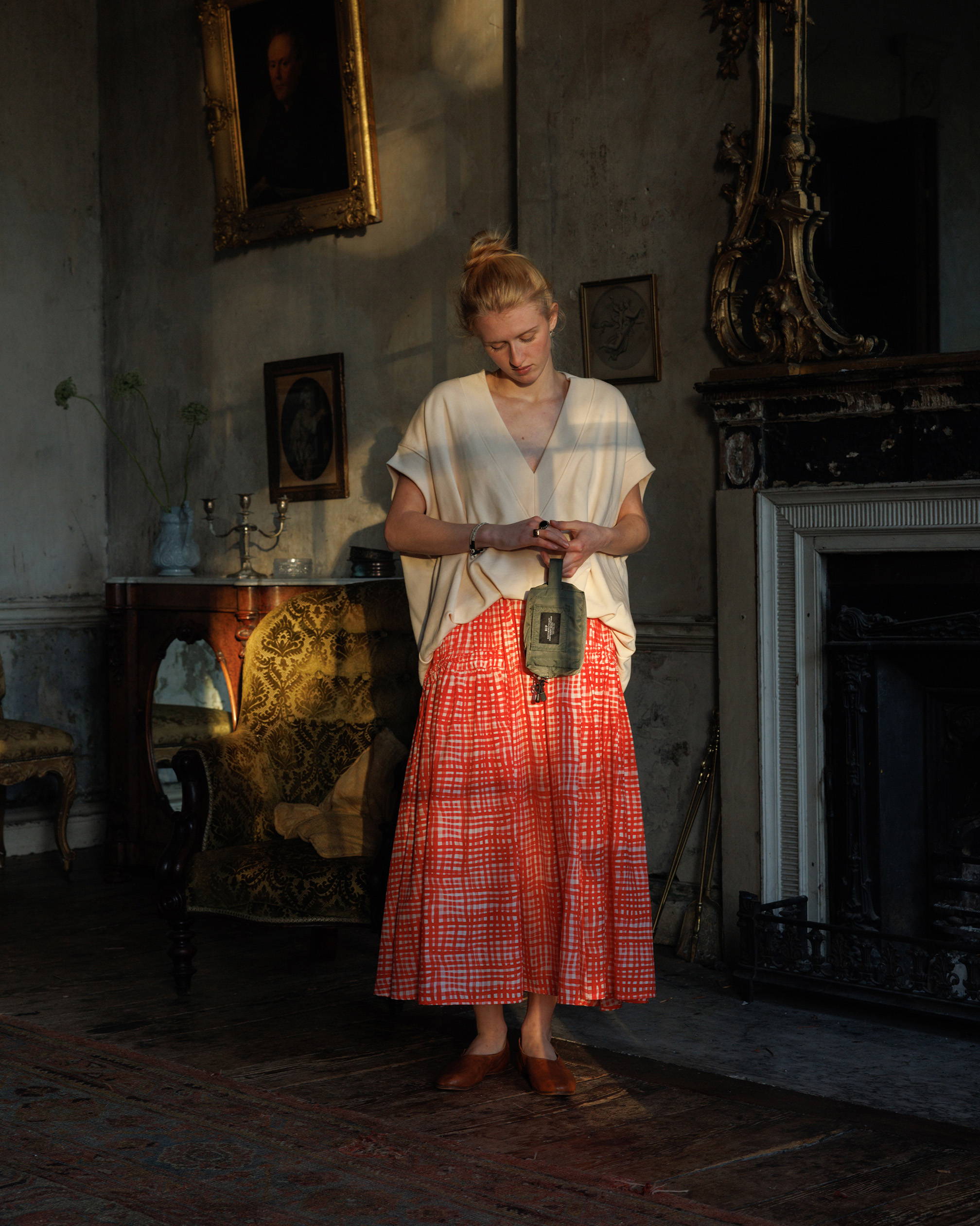 Dries Van Noten V-Neck Sweater Ecru, Toogood The Harvester Skirt Jam/Check, Guidi 626R Full Grain Brown Ballerina Slip On, BAGSINPROGRESS Mini Belt Pouch Khaki Green, Maria Rudman Elvire & Sonia Beaded Bracelets, Rosa Maria Earrings & Rings.